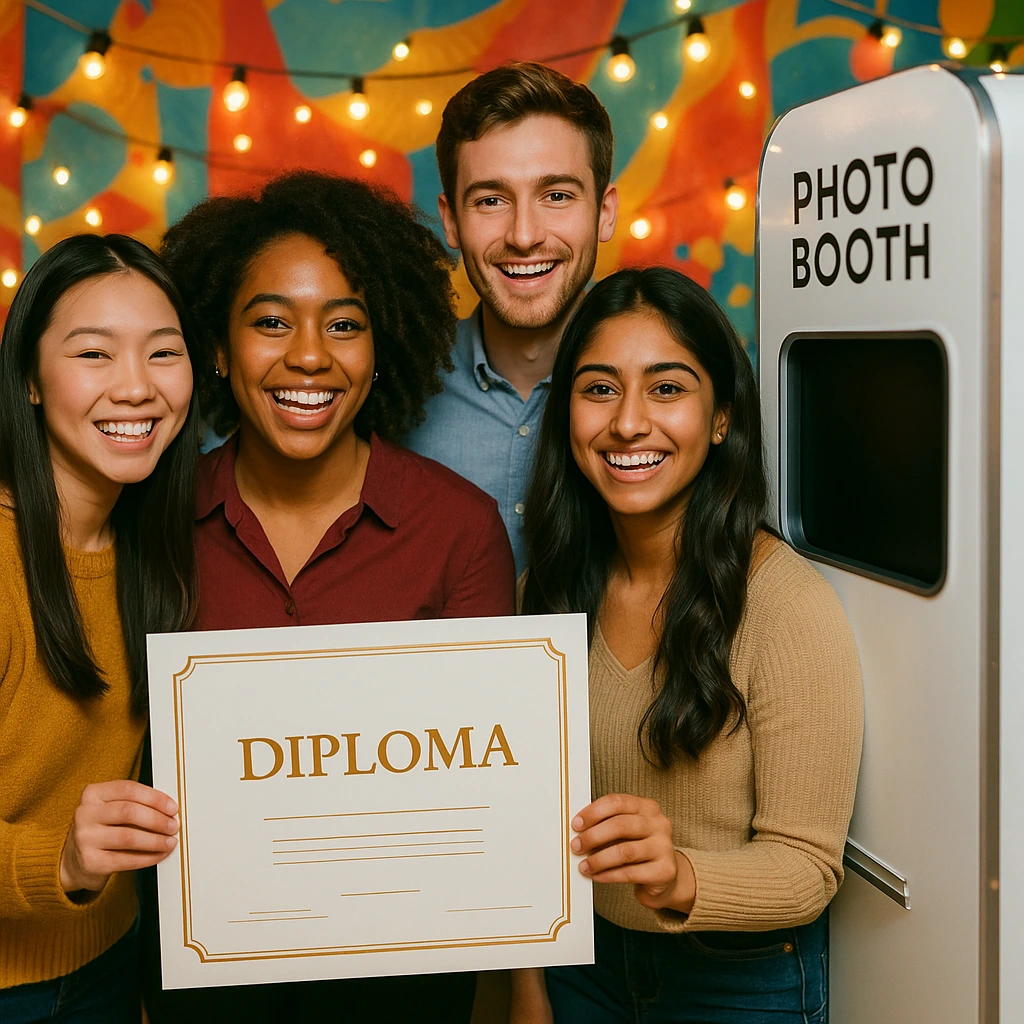 Cada invitado se lleva su foto impresa al instante con una plantilla personalizada con el logo del colegio, universidad o generación.